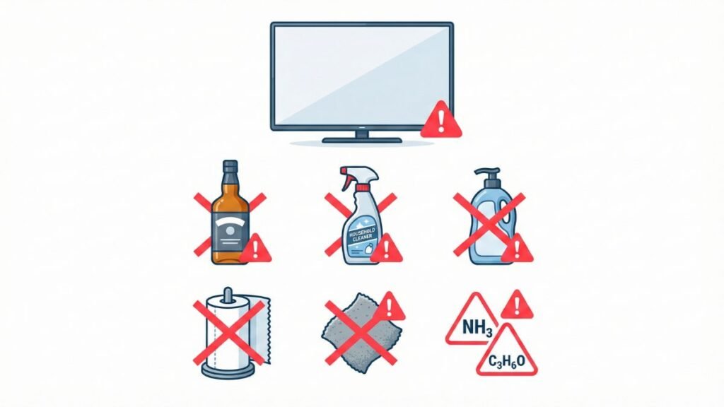 Por que danificam a tela (explicação técnica curta): muitos desses produtos têm solventes que alteram ligações químicas das camadas antirreflexo/oleofóbicas ou deixam resíduos hidrofóbicos. Atrito com fibras duras provoca microcortes na superfície, degradando a reflectância e a reprodução de cores.